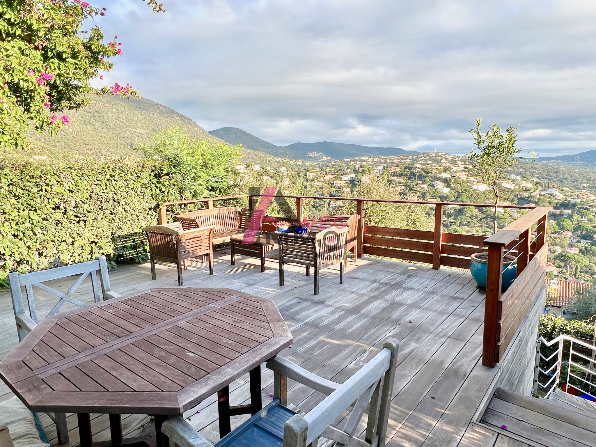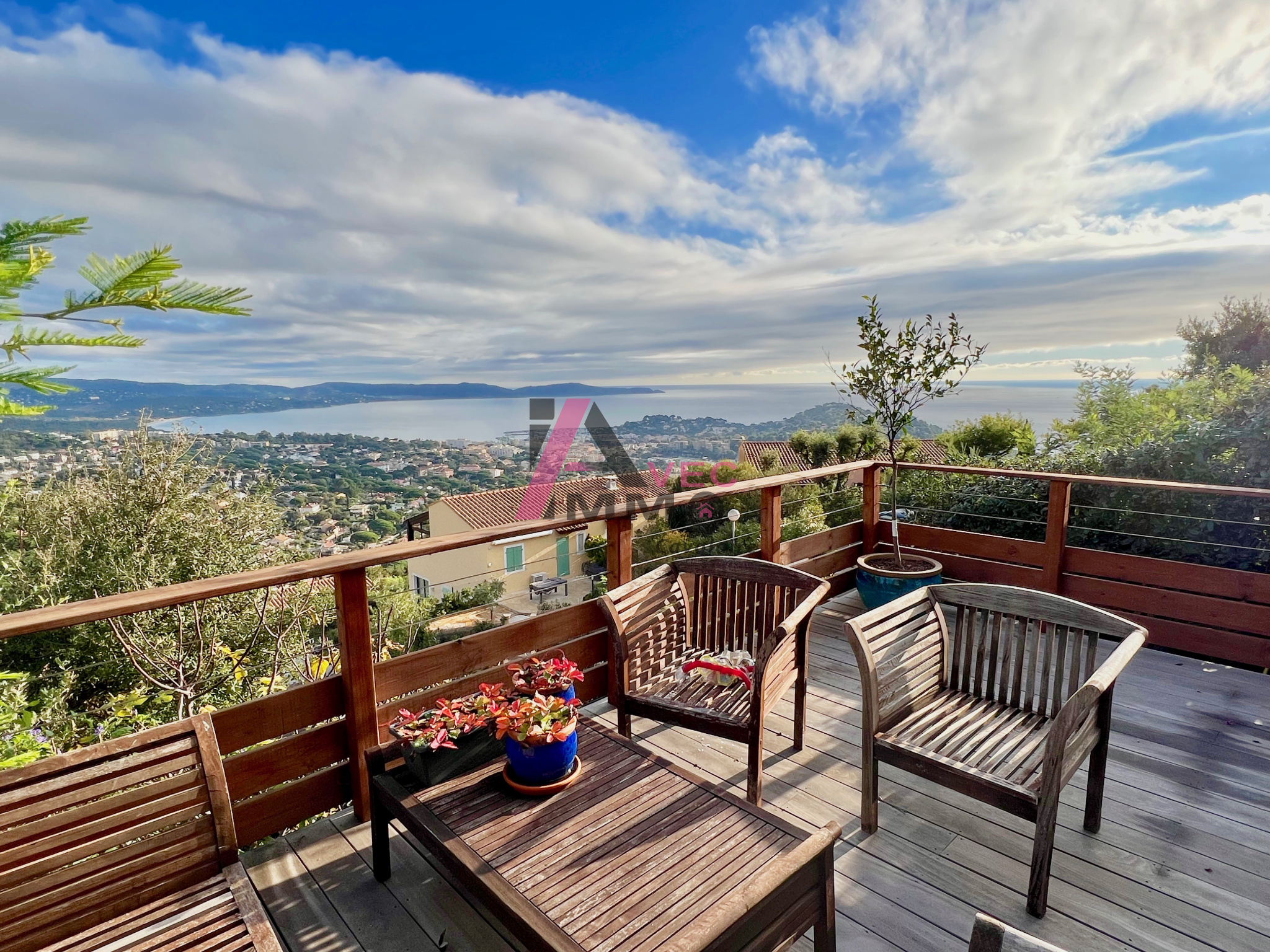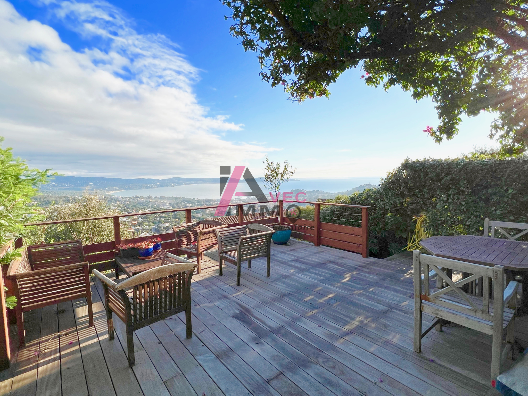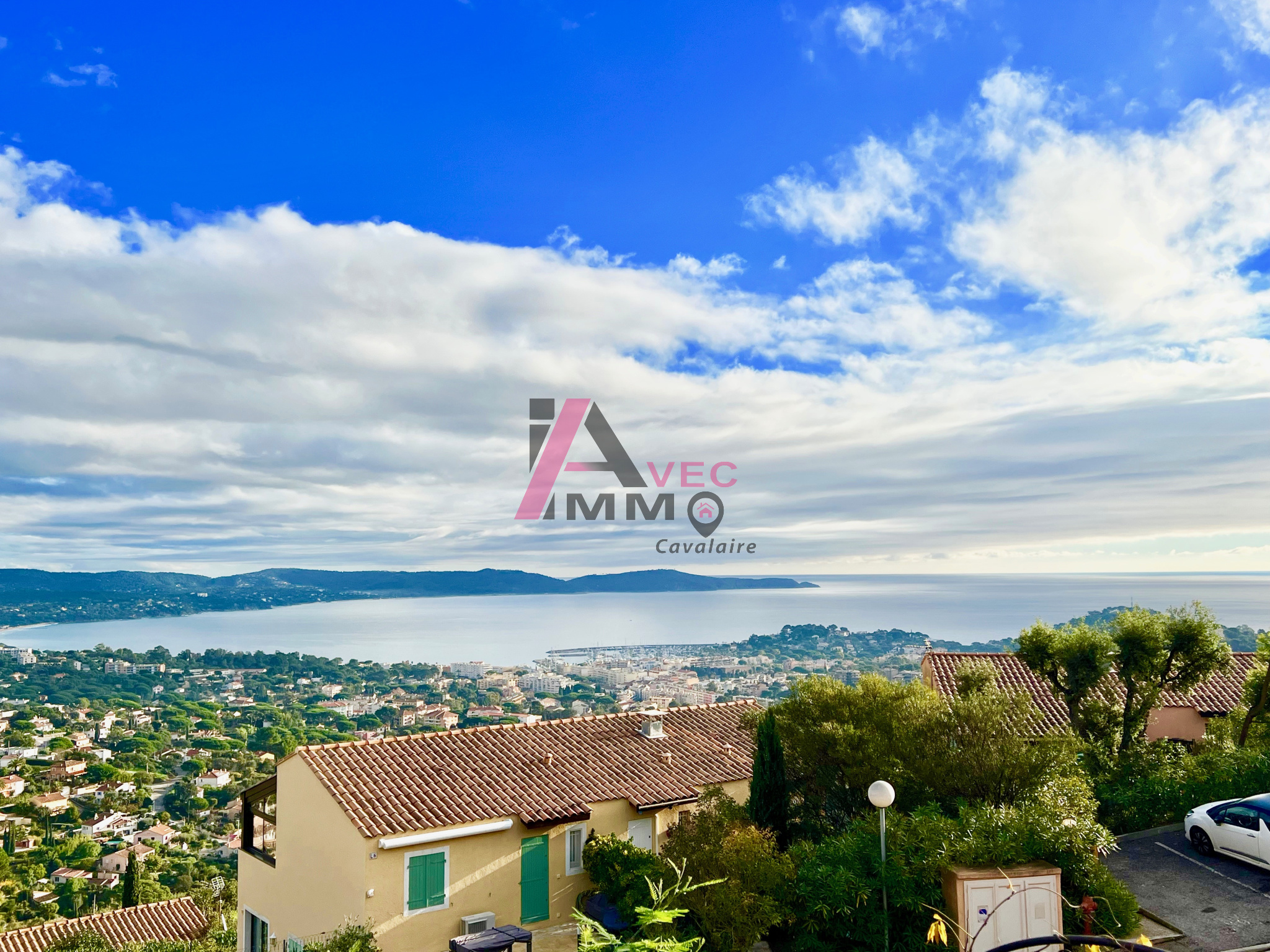 L' agence AVEC IMMO vous propose ce bel appartement type mazet à Cavalaire situé sur les hauteurs avec une vue Mer Panoramique à couper le souffle. Dans une résidence très recherchée pour son calme et sa vue, il se compose d'un coin salon, une salle à manger avec cuisine ouverte, un wc avec buanderie, une chambre parentale avec sa salle d'eau, une magnifique terrasse en bois de plus de 40M2 qui surplombe toute la baie, un jardinet et un garage fermé. Joli produit avec vue d'exception.